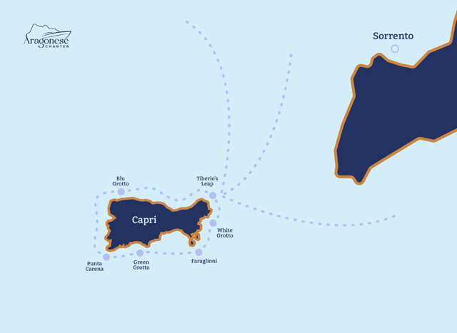 Capri è una delle mete più gettonate del Golfo di Napoli, e offriamo un’ampia scelta di punti di prelievo: dai porti di Napoli, Ischia e Sorrento, agli hotel e alle stazioni, agli aeroporti della zona. Possiamo venire a prendervi da diversi hotel come: Hotel Quisisana, Capri Tiberio Palace, Punta Tragara, JK Place Capri, Hotel La Palma. Una volta prenotato il tour, il nostro servizio di terra vi accompagnerà al punto di imbarco, e il tour in barca partirà tra le 10:00 e le 11:00, con rientro previsto per le 17:00 circa. Gli orari di partenza sono flessibili, quindi possiamo adattarci alle vostre esigenze